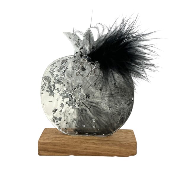 Διακοσμητικό ρόδι. Χειροποίητο διακοσμητικό γούρι ρόδι από υγρό γυαλί με φύλλα ασημί , μαύρο χρώμα ,φτερό και μεταλλικό 2026. Μια πρωτότυπη ιδέα για γούρι εξολοκλήρου φτιαγμένη στο χέρι. Το ξύλο προέρχεται από τη περιοχή μας και το επεξεργαζόμαστε οι ίδιοι. Ένα διαφορετικό γούρι από τα συνηθισμένα όπου μπορείτε αργότερα να αφαιρέσετε το έτος και να το έχετε διακοσμητικό. Εντυπωσιακό, μοναδικό διακοσμητικό για το χώρο σας για να σας φέρει καλοτυχία. Το γούρι ρόδι σε ξύλινη βάση με είναι ιδανικό για να στολίσετε το σπίτι, το γραφείο και τον προσωπικό σας χώρο ή να το προσφέρετε δώρο.