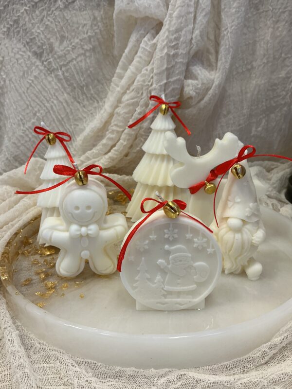Λευκό χειροποίητο κερί σε σχήμα gingerbread ανθρώπου, με κόκκινη κορδέλα και χρυσή καμπανούλα. Μια γλυκιά, γιορτινή πινελιά για το σπίτι ή για δώρο!
