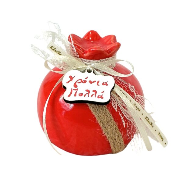 Κόκκινο ρόδι γούρι κεραμικό. Το ρόδι σαν γούρι διακοσμητικό φέρνει τύχη, καθώς προσφέρει την αφθονία και τη γονιμότητα. Είναι επίσης, σύμβολο καλοτυχίας και αιωνιότητας. Μπορείτε να το προσφέρετε δώρο στους αγαπημένους σας που κάνουν μία καινούργια επιχειρηματική ή προσωπική αρχή. Ακόμα σαν διακοσμητικό στο σπίτι ή στην εργασίας ή σε μία επίσκεψη που θα κάνετε στις γιορτές. Το κόκκινο κεραμικό γούρι ρόδι είναι 8εκ. περιέχει δαντέλα, κορδέλα με ευχές και ξύλινο στοιχείο χρόνια πολλά. Η λάμψη του είναι μοναδική και θα αλλάξει αισθητικά κάθε χώρο στο οποίο θα τοποθετηθεί.