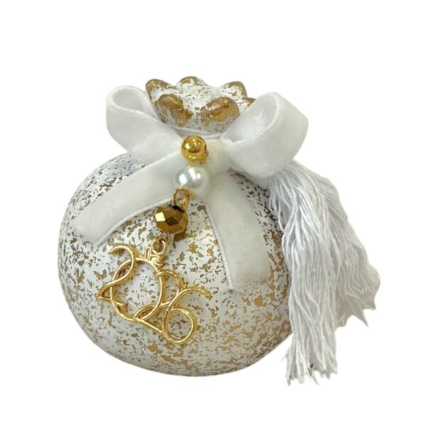 Λευκό ρόδι γούρι κεραμικό. Το ρόδι σαν γούρι διασκοσμητικό φέρνει τύχη, καθώς προσφέρει την αφθονία και τη γονιμότητα. Είναι επίσης, σύμβολο καλοτυχίας και αιωνιότητας. Μπορείτε να το προσφέρετε δώρο στους αγαπημένους σας που κάνουν μία καινούργια επιχειρηματική ή προσωπική αρχή. Άκομα σαν δικοσμητικό στο σπίτι ή στην εργασίας ή σε μία επισκεψή που θα κάνετε στις γιορτές. Το λευκό κεραμικό γούρι ρόδι είναι 7εκ. με βελούδινη κορδέλα ,μεταλλικό 2026 και λευκή φούντα Έχει ματ λεύκο χρώμα με χρυσές λεπτομέρειες και ταιριάζει αισθητικά σε κάθε χώρο.